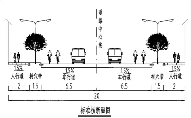 道路横断面布置为三块板断面,中间14.5米机动车道,两侧各2米绿化带、2.5米非机动车道、3.25米人行道(含1.5米树穴带)。