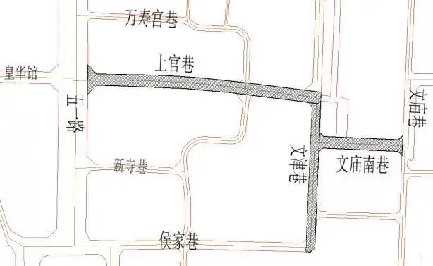 上官巷,东起文津巷、西至五一路(长约425米),用地约0.9公顷;规划红线宽20米:中间9米车行道,两侧各5.5米人行道(含树穴带)。