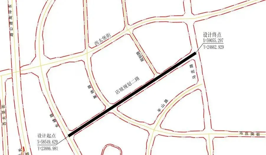 西起东峰路、东至马庄路(长约926米),用地约2.8公顷;规划红线宽30米:中间14.5米机动车道,两侧各2米绿化分隔带,2.5米非机动车道,3.25米人行道(含树穴带)。