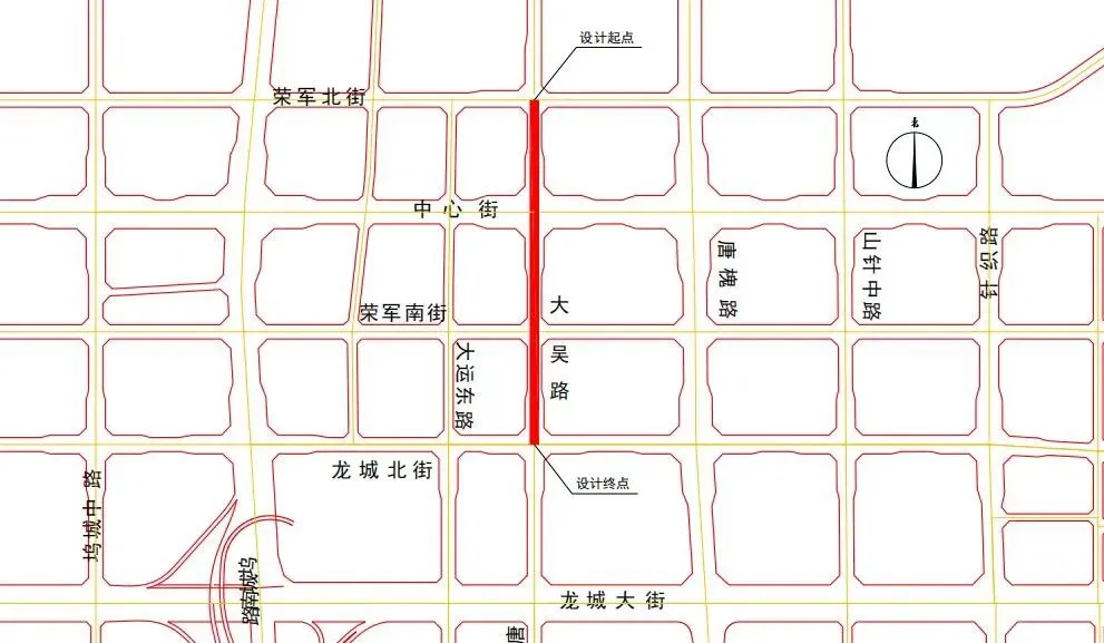 北起荣军北街、南至龙城北街(长约726米),用地约2.1公顷;规划红线宽30米:中间14.5米机动车道,两侧各2米绿化分隔带,2.5米非机动车道,3.25米人行道(含树穴带)。