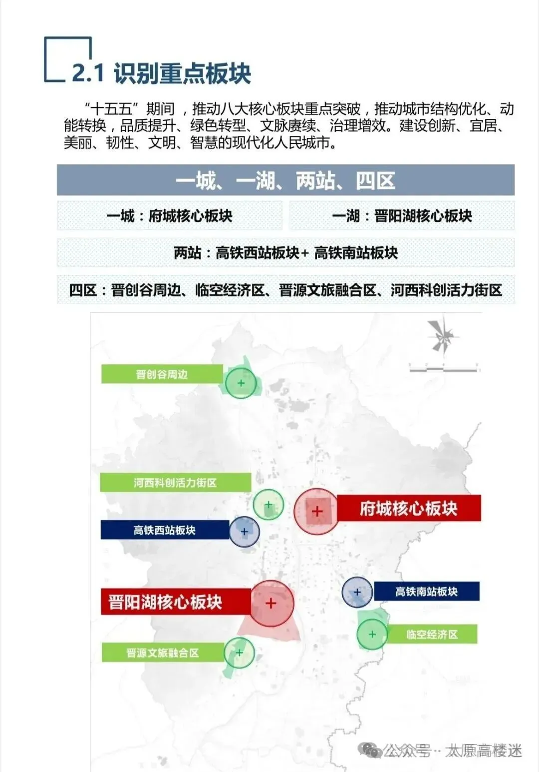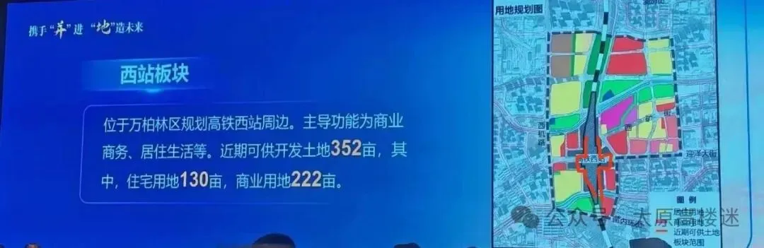 太原西站板块位于万柏林区规划太原西站周边。主导功能为商业商务、居住生活等。近期可供开发土地352亩,其中住宅用地130亩,商业用地222亩。从规划图中能看出,太原西站位于迎泽大街正上方,或将成为一座高架车站上面跑高铁、地面有城市道路、地下还有地铁。