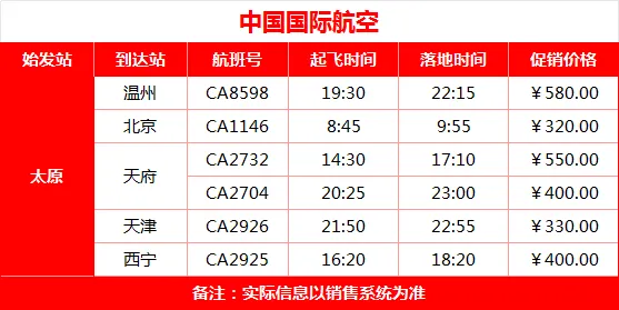 如果你从太原出发,想看有没有直飞的实惠选择,中国国航公布了一批太原始发的促销航班,覆盖北上、川渝等方向,低价可找得到。