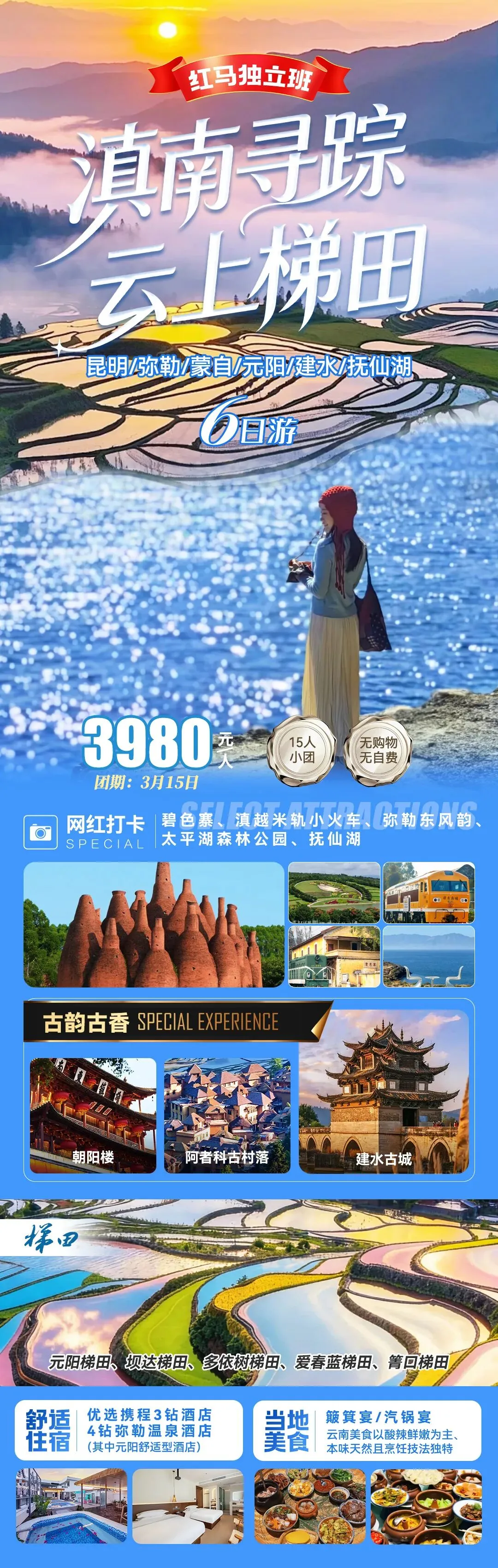 【红马自营】太原出发去旅行社-滇东南双飞六日游/昆明/弥勒/蒙自/元阳/建水/抚仙湖