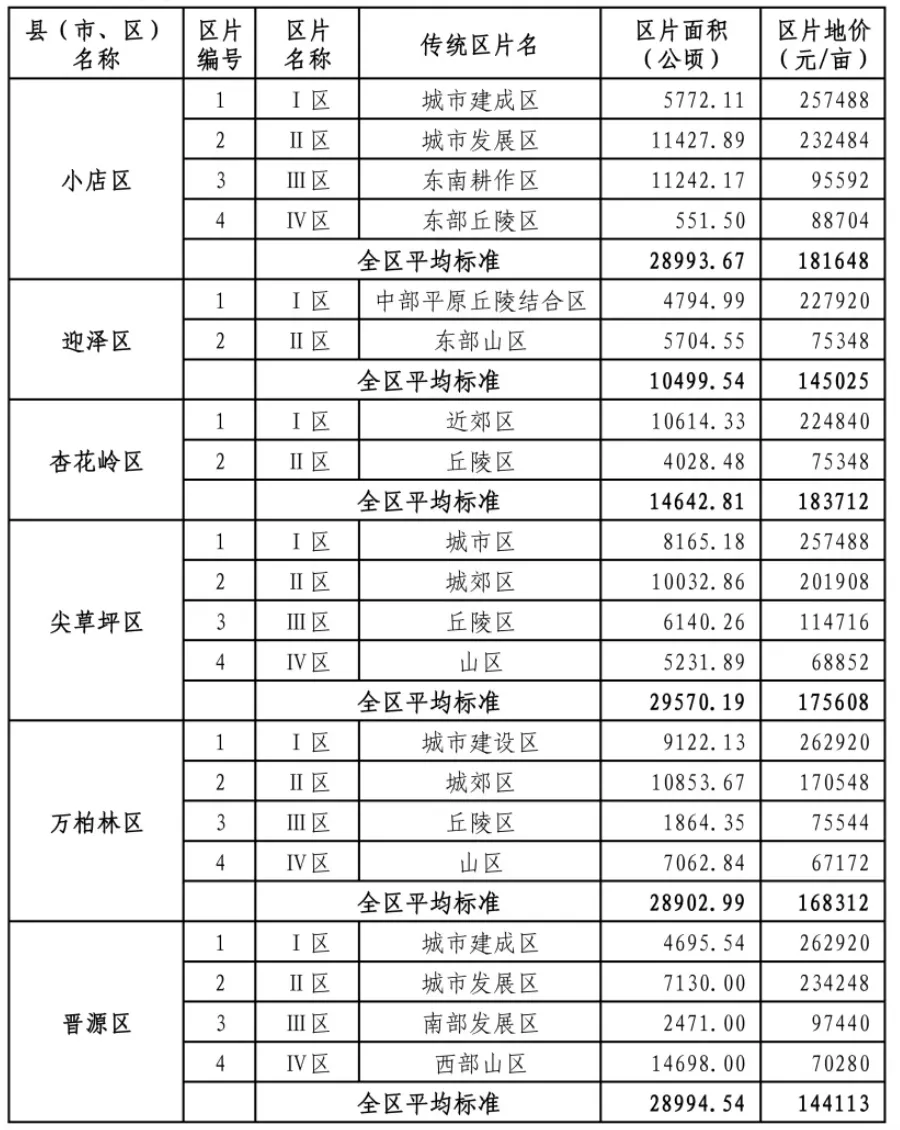 2018年后,太原市出台政策要求城中村改造以实物安置为主、货币化安置为辅,晋源区等地进一步限制宅基地面积(如最大按4.2分地计算补偿),超出部分补偿金额显著降低。然而,近两年来随着楼市整体进入调整期,城中村拆迁逐年减少。根据官方回复,2026年尖草坪区暂无城中村改造计划;去年9月30日,小店区也回复:经了解,我区目前暂无新的拆迁计划。因此从目前的情况看,2026年太原城中村改造的核心以“回迁交付与前期筹备”为主,新启动拆迁较少。但因为道路、学校等工程建设等原因,太原市近年来征地却很多。近日,山西省人民政府网站发布了《山西省人民政府关于重新公布全省征地区片综合地价的通知》,明确:征地区片综合地价由土地补偿费和安置补助费两部分组成,其中土地补偿费占40%,安置补助费占60%。其中也给到了太原市及下辖各县(市、区)的区片地价表,核心反映了不同区域的土地价值差异,具体如下:1、太原市六城区的平均地价均在14万元/亩以上,其中小店区、杏花岭区、尖草坪区、万柏林区的平均地价超过16万元/亩,反映出主城区土地价值极高;2、小店区、尖草坪区、万柏林区、晋源区的核心建成区地价均达到 25-26 万元 / 亩,是太原市土地价值的 “第一梯队”;3、郊县(市)的平均地价远低于城区,普遍在3-5万元/亩 区间,与主城区形成明显梯度;4、即使在同一县(市)内,地价差异也很大。例如清徐县县城规划区地价达 12.4万元/亩,而北部山区仅2.9万元/亩;5、太原六城区平均地价是郊县(市)的3-5倍,体现了太原作为省会城市的核心聚集效应;6、太原市平均标准:区片面积合计690900.96公顷,平均地价64523元/亩。值得一提的是,上述标准不包括农村村民住宅、其他地上附着物和青苗补偿费。1、征地是国家为了公共利益需要,依照法律规定的程序和权限,将集体所有的土地转为国有土地,并依法给予被征地的农村集体经济组织和被征地农民合理补偿和妥善安置的法律行为。具体到每个项目,还会有地上附着物和青苗的补偿细则。2、拆迁是指因城市建设、公共利益或商业开发等需要,对国有土地上的房屋进行拆除,并对土地及房屋所有人进行补偿和安置的行为。拆迁补偿会参考周边商品房价格进行评估,同时会有搬迁费、过渡费等地方标准,具体以征收公告为准。