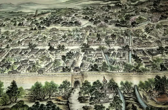 晋祠堡形成晋祠外八景之一的“山城烟堞”。“晋祠堡城在悬瓮山麓,自东遥望,俨在山半,故名之曰山城。”[28]乾隆时期杨二酉的《晋祠全景诗十六首》中《山城烟堞》描写此景色为:“山城亦如画,咫尺即仙源。但见炊烟起,不闻人语喧。家家汲新水,面面种蔬园。景多吟不迨,方信陆生言。”[29]乾隆时期赵德谦的《晋祠内外八景诗十六首》中《山城烟堞》云:“层叠浮岚半有无,却凝烟火出山都。分明地接云霞近,带水连山人画图。”[30]刘大鹏的《晋祠全景诗十六章》中《山城烟堞》云:“青山绕处即长城,薄雾轻烟左右横。叠叠螺峰微雨过,重重雉堞夕阳睛。云霞隔岫频酬答,风月穿墉愤送迎。壁垒一新深锁黛,直教鱼钥启邮庚。”[31]直到上世纪三十年代仍能见到这个景象, 张庆亨的《晋祠指南》载:“晋祠城堡在祠东,和祠相连,古唐村同晋祠镇的民商二户,夹居其中。内分南、北、中三堡,周约四里左右,环围着由石砌成丈七八尺高的城墙。我们在城外只见炊烟缕缕起,难听人声半点喧,此又一番风景。为祠外八景之一,即‘山城烟堞’也。”[32]1935年李健游览晋祠,他在《晋省纪游》中说:“饭后离祠东行,见有高垣如城,雉堞尚好,询知为晋祠城堡。”[33]