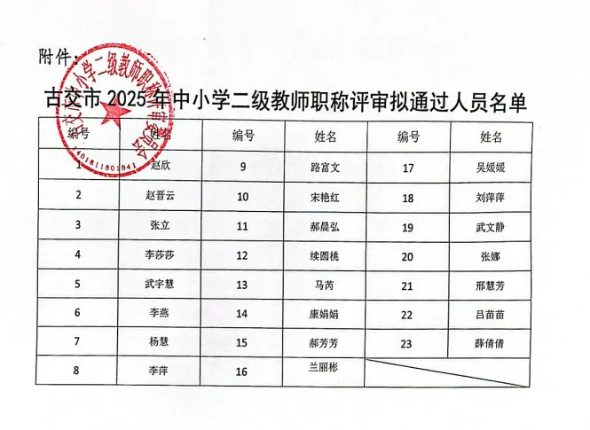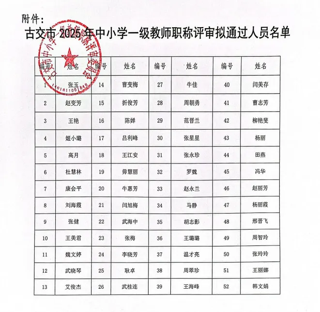 附件:古交市2025年中小学一级教师职称评审拟通过人员名单古交市中小学一级教师职称评审委员会