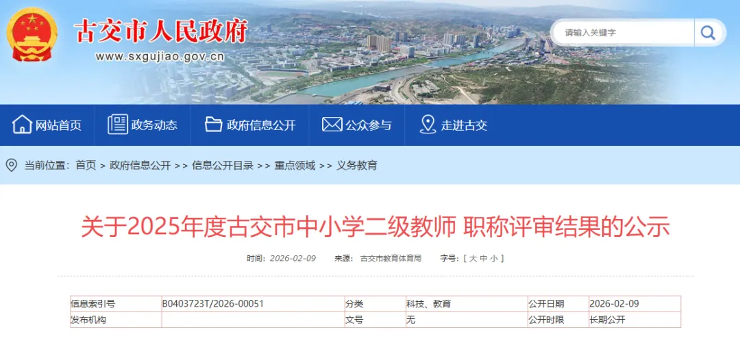 经古交市中小学二级教师职称评审委员会2026年2月9日会议评审,通过赵欣等23名中小学二级教师职称。为保证评审工作的公开、公平、公正,现将本次评审通过的23名人员名单公示,欢迎本人所在单位及有关部门对此结果进行监督。如有意见,请在公示之日起五个工作日内反映情况。反映情况须客观真实,以单位名义反映情况的材料需加盖单位公章;以个人名义反映情况的材料应署真实姓名、工作单位和联系方式;以匿名形式反映情况和问题的不予受理。公示期结束后将不再受理相关问题反映。