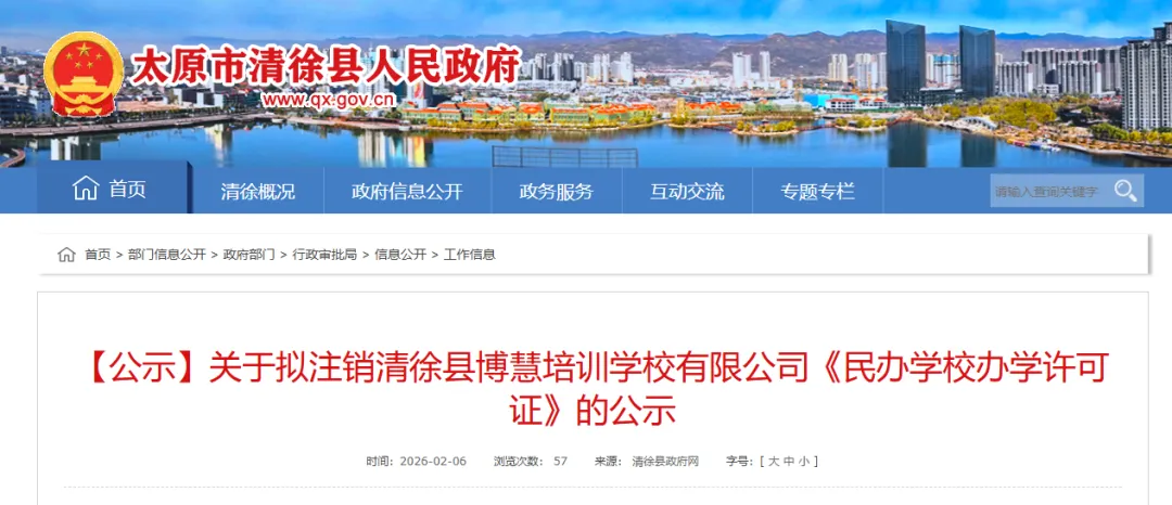 清徐县博慧培训学校有限公司于2026年2月6日主动向我局提交了民办学校终止办学的申请。根据《中华人民共和国行政许可法》、《中华人民共和国民办教育促进法》和《中华人民共和国民办教育促进法实施条例》等相关规定,拟同意终止其办学资格并依法注销该校的《民办学校办学许可证》,现公示如下: