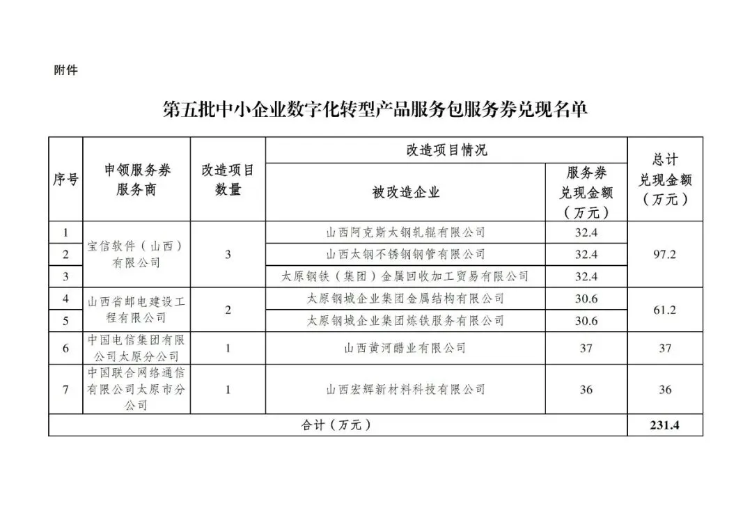 太原市工业和信息化局 | 关于第五批中小企业数字化转型产品服务包服务券兑现名单的公示