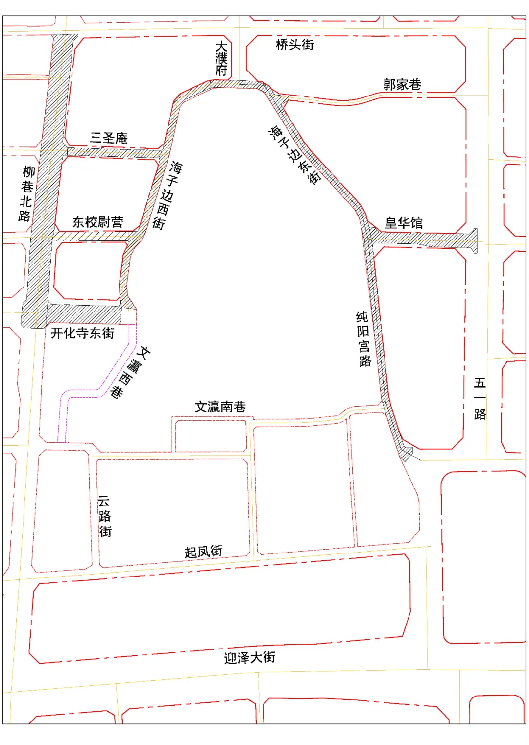 海子边东街:南起皇华馆,北至大濮府,长约319米,规划红线宽10米,用地面积约0.33公顷。