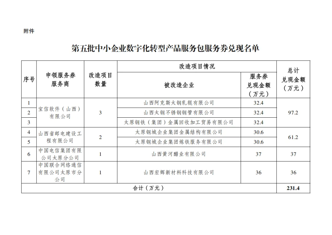 根据《中小企业数字化转型专项资金使用管理暂行办法》《关于印发〈太原市中小企业数字化转型“小快轻准”产品服务包推广应用实施细则〉的通知》《关于组织开展中小企业数字化转型产品服务包服务券兑换工作的通知》有关要求,我局组织开展了第五批中小企业数字化转型产品服务包服务券兑换工作,经第三方机构评测验收、县区推荐上报、市级评审、会议研究等程序,现将第五批中小企业数字化转型产品服务包服务券兑现名单予以公示(详见附件),如有异议,请在公示期内以书面形式反馈我局,并提供必要的佐证材料。