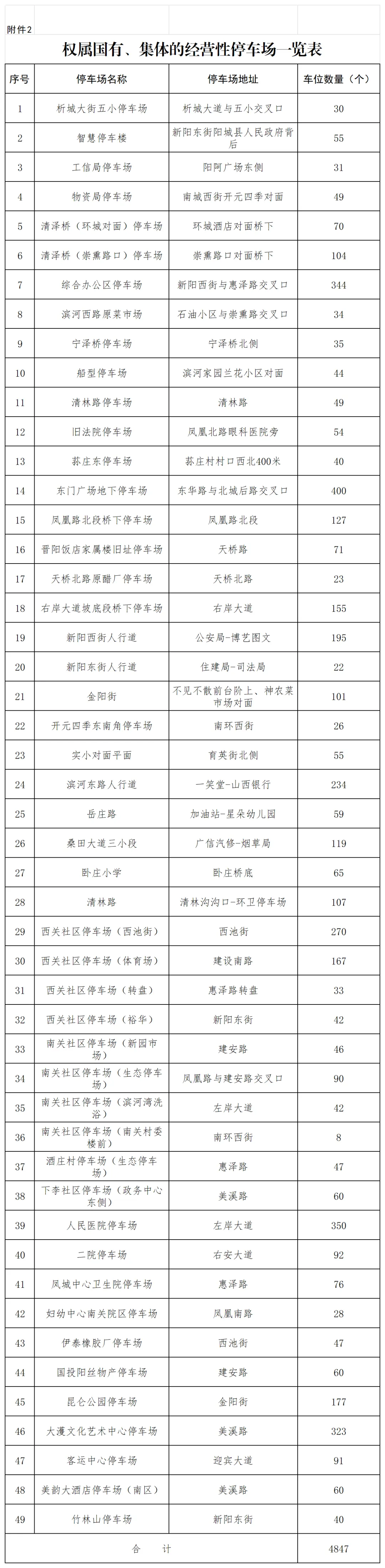 (二)权属国有、集体的经营性停车场(附件2):共计49处4847个停车位。
