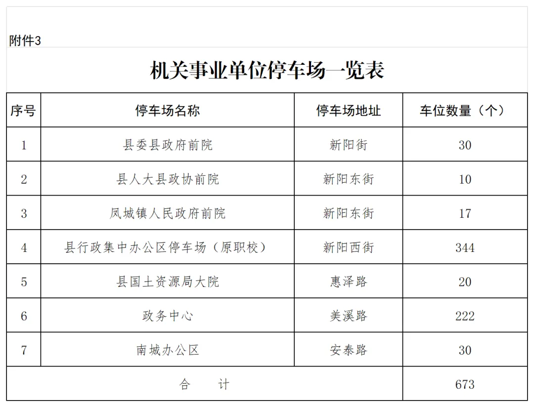 (三)机关事业单位停车场(附件3):共计7处673个停车位。