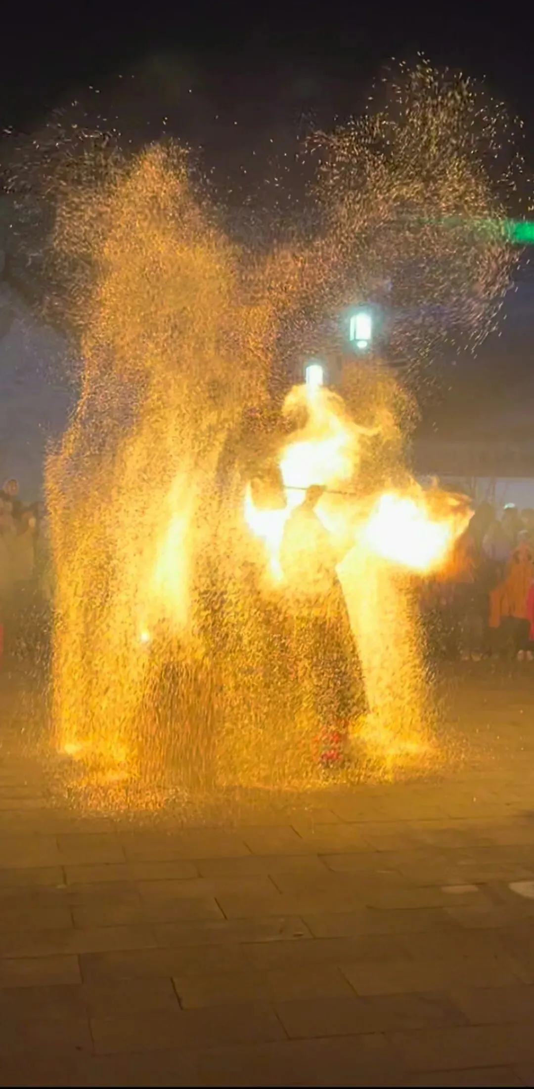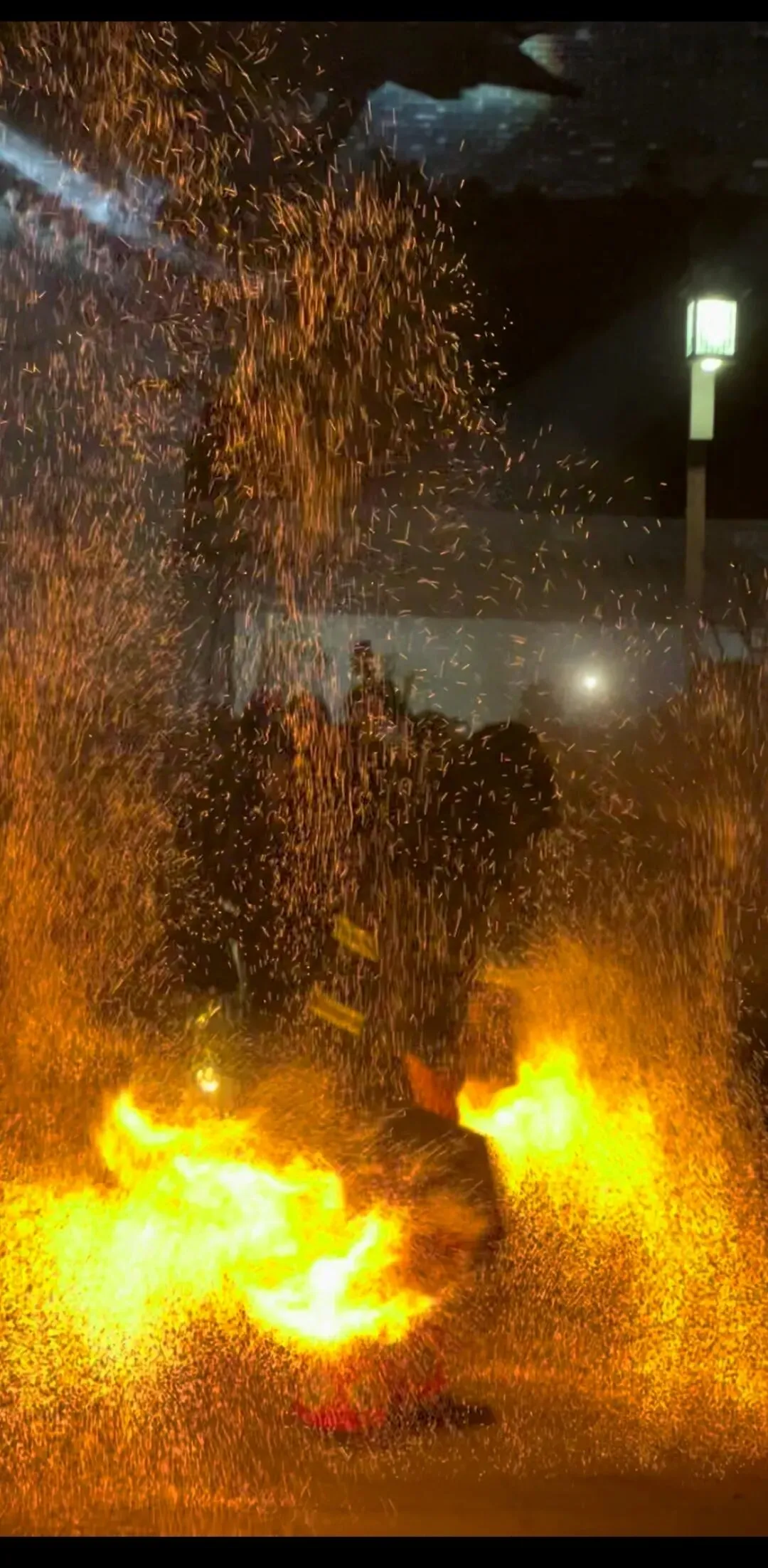 当火流星出现时,整个广场的气氛被推向了高潮。长绳两端的铁笼在高速旋转中,化作一个巨大的、燃烧的火轮,仿佛要将整个夜空都包裹其中。