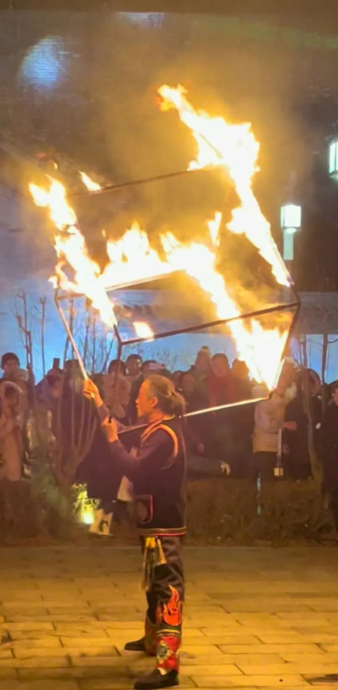 最让人惊叹的,是压轴的火立方表演。一个重达数斤的金属立方体,在艺人手中仿佛失去了重量,它在身前、头顶、身后流畅翻转,火焰被甩成立体的棱角,在夜空中勾勒出一个燃烧的“魔方”。