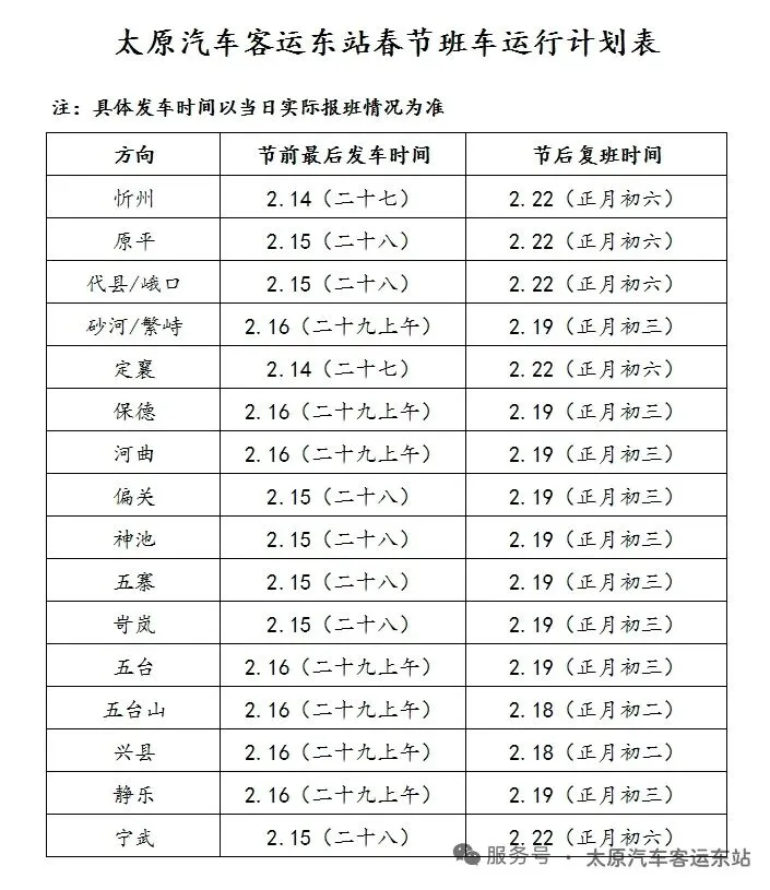 太原东客站春节班车运行计划表