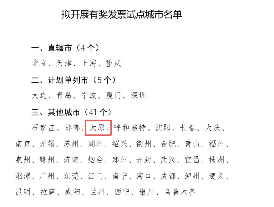 1月23日,国家税务总局网站消息,商务部、财政部、国家税务总局1月23日对外公示拟开展有奖发票试点城市名单,包括太原在内的50个城市入选。这一评审结果公示期为2026年1月23日至2026年2月2日。
