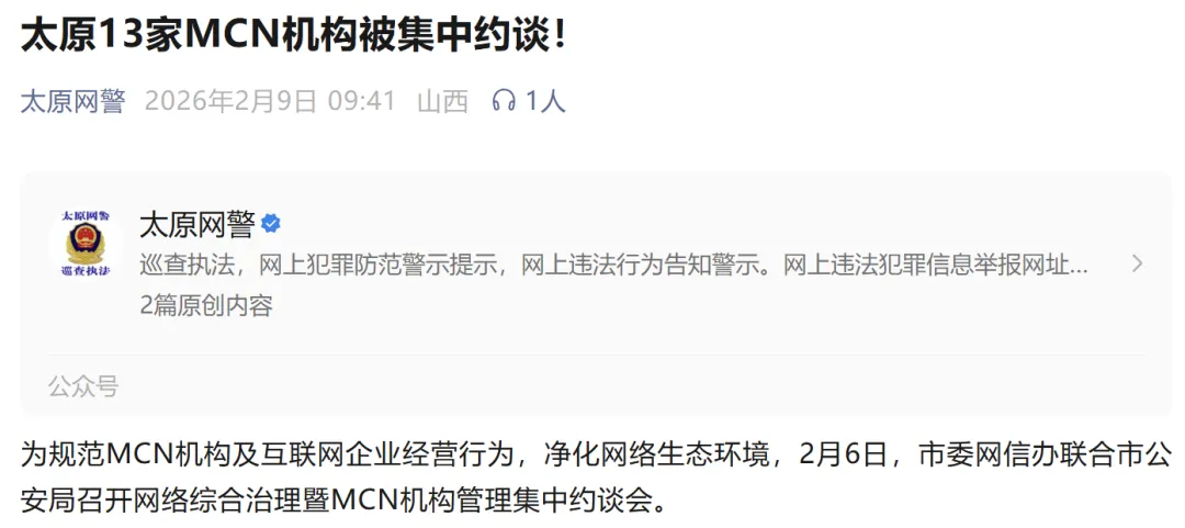 近日,太原市网信办联合市公安局组织召开网络综合治理暨MCN机构管理集中约谈会,对当地13家MCN机构进行集中约谈。会议重点强调了规范行业行为的重要性,明确了AI技术生成内容的审核标准与责任划分,并通报了本地企业违规案例及行政处罚情况。