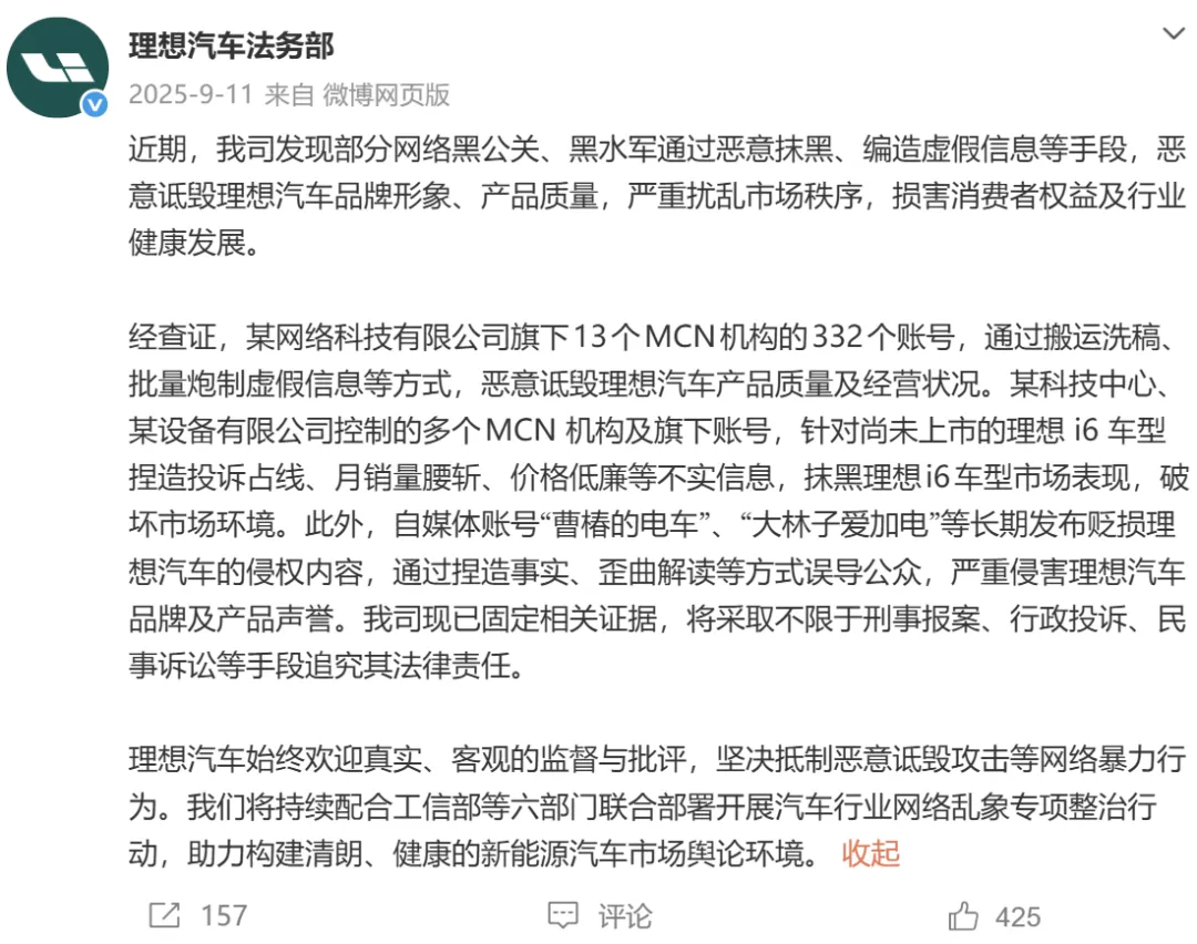 官方特别指出,近期部分MCN机构及博主针对小米、理想等新能源车企进行贬损及恶意评价,严重损害企业品牌声誉,扰乱市场环境。会议要求MCN机构及网络内容创作者必须严格遵守行业规范与商业伦理,不得组织或参与网络水军、恶意投诉、引战炒作等行为,共同维护公平竞争、健康清朗的网络生态。
