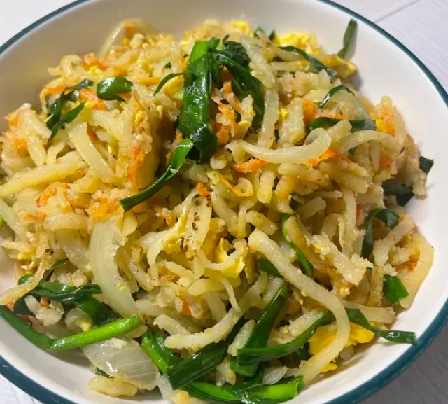 最推荐的,是“不烂子”。这名字听着土,吃着是真香。做法简单也讲究:把土豆擦成丝,裹上面粉,上锅蒸熟。这还没完,得再起锅烧油,放上葱花蒜末干辣椒,把蒸好的土豆丝倒进去大火爆炒。出锅时,土豆丝外焦里嫩,面粉的焦香裹着土豆的绵软,一口下去,咔嚓一声,接着是满嘴的软糯,碳水的快乐在这一刻达到了顶峰。