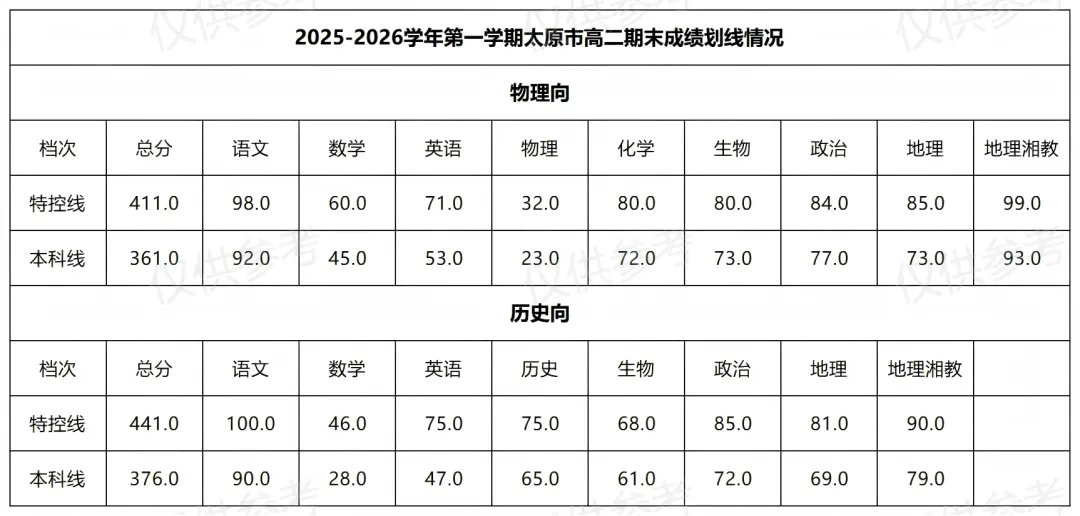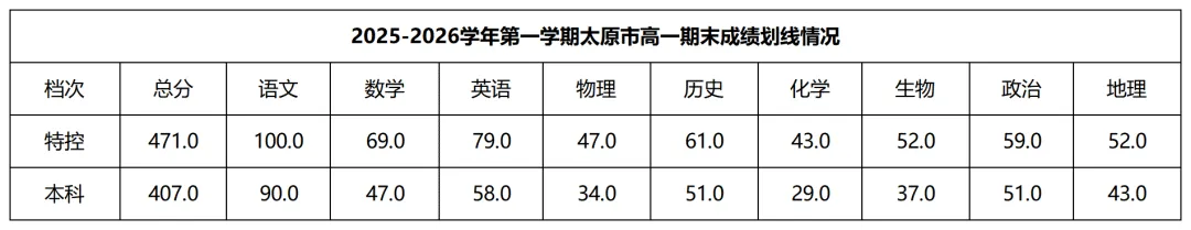 >2026年太原市第一学期期末高中各年级分数线划定
