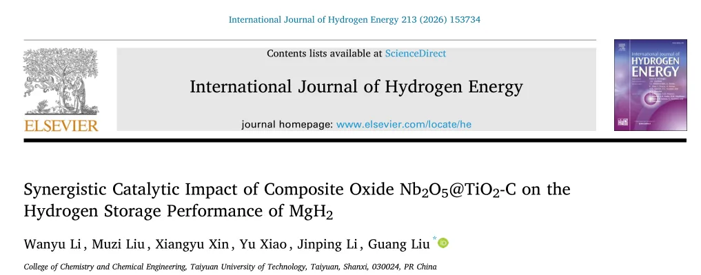 2026年,太原理工大学刘光教授团队在International Journal of Hydrogen Energy期刊发表题为“Synergistic Catalytic Impact of Composite Oxide Nb2O5@TiO2-C on the Hydrogen Storage Performance of MgH2”的研究论文,刘光教授为通讯作者。