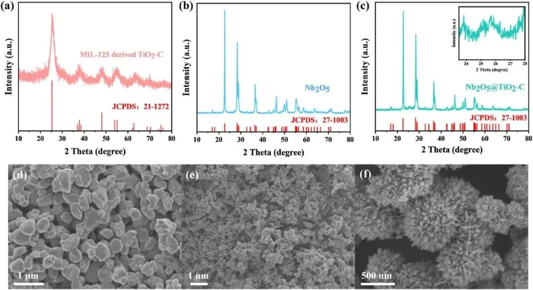 利用X射线衍射(XRD)、扫描电子显微镜(SEM)、透射电子显微镜(TEM)、X射线光电子能谱(XPS)等表征手段证实了Nb₂O₅@TiO₂-C复合催化剂的成功合成及独特结构特征。XRD测试显示,MIL-125衍生的TiO₂-C与标准TiO₂晶型匹配但结晶度较低,纯Nb₂O₅衍射峰尖锐且与标准图谱一致,结晶度高;Nb₂O₅@TiO₂-C的XRD图谱主要匹配Nb₂O₅,25.3°处的弱宽峰对应TiO₂-C,因MIL-125用量少且Nb₂O₅为核壳结构表面相,故TiO₂-C特征峰不明显,整体复合材料结晶度良好。