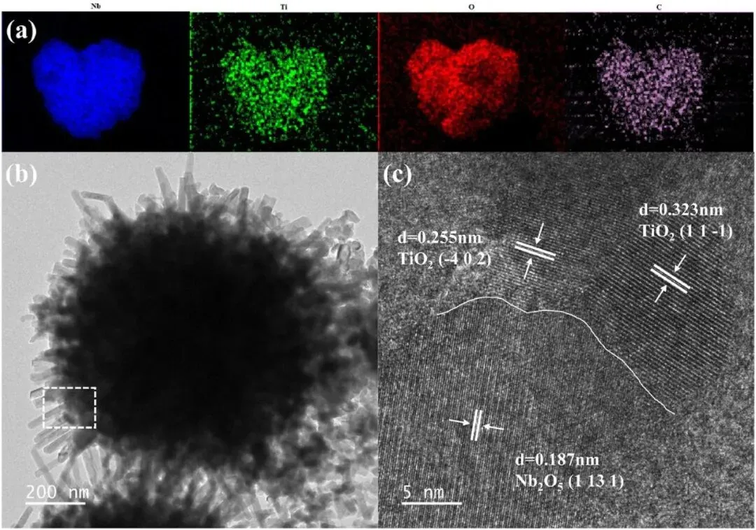 SEM表征揭示了材料形貌演变:原始MIL-125为圆饼状,退火后TiO₂-C呈约500 nm的不规则块状,纯Nb₂O₅为100 nm左右且轻微团聚的纳米颗粒,而Nb₂O₅@TiO₂-C为500 nm~1 μm的梧桐果状形貌,TiO₂-C为核,表面生长大量棒状Nb₂O₅,与纯Nb₂O₅的颗粒状形貌不同,说明TiO₂-C载体调控了Nb₂O₅的生长路径。EDS元素分布图证实Nb、Ti、O、C在复合催化剂中均匀分布,HRTEM清晰观测到TiO₂的(11-1)、(-402)晶面和Nb₂O₅的(1131)晶面的晶格条纹,二者界面接触良好,结合XPS对Nb 3d和Ti 2p的分析,进一步验证了复合催化剂的成功制备。