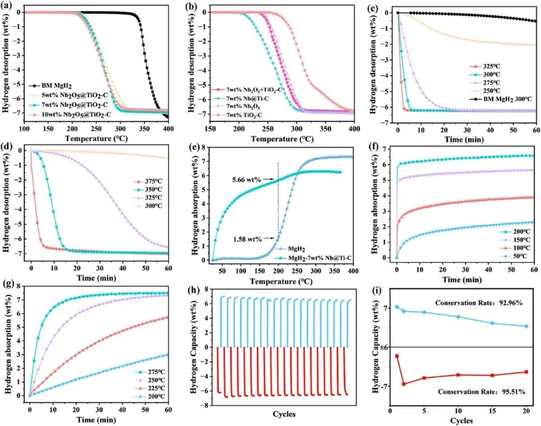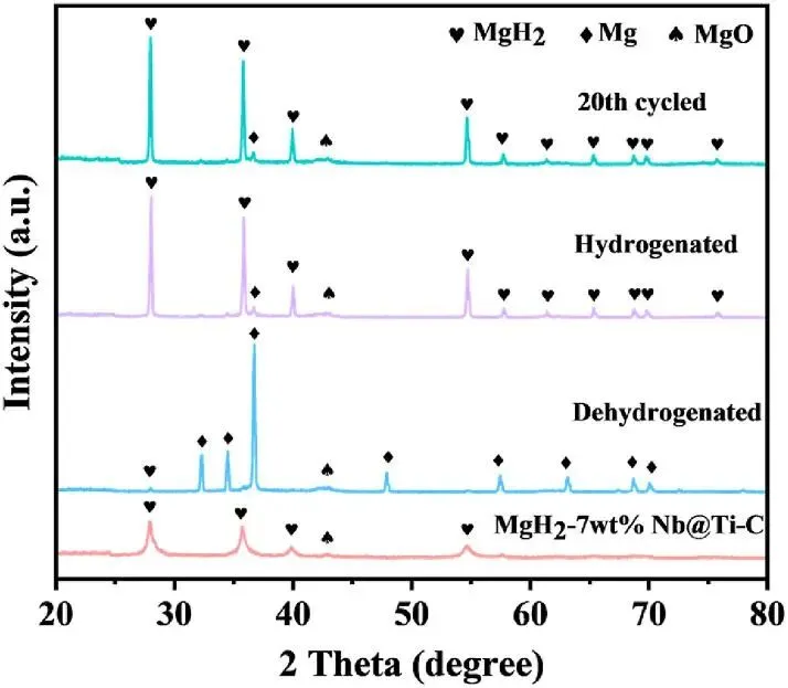 MgH2-7 wt.% Nb2O5@TiO2-C复合材料的脱氢活化能较球磨纯MgH2降低了42%,且经过20次吸放氢循环后,该复合材料的脱氢容量保持率仍可达95.51%。研究表明,纳米五氧化二铌在催化过程中发挥主导作用,而二氧化钛-碳不仅作为五氧化二铌的负载载体,还起到了辅助催化的效果。