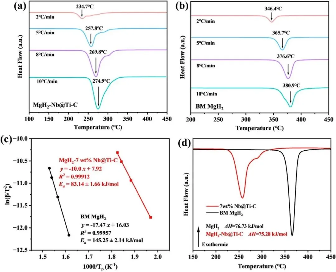 DSC测试结合Kissinger方法,明确了复合催化剂对MgH₂储氢的动力学优化作用,且对热力学无明显影响。不同升温速率下的DSC图谱显示,MgH₂-7 wt.% Nb₂O₅@TiO₂-C的脱氢峰温度显著低于球磨纯MgH₂;通过Kissinger方法计算,复合催化剂改性后的MgH₂脱氢表观活化能为83.14±1.66 kJ/mol,较球磨纯MgH₂的145.25 kJ/mol降低约42%,JMAK模型结合Arrhenius方程计算的活化能为85.72 kJ/mol,与Kissinger结果高度一致,证实动力学提升的可靠性。