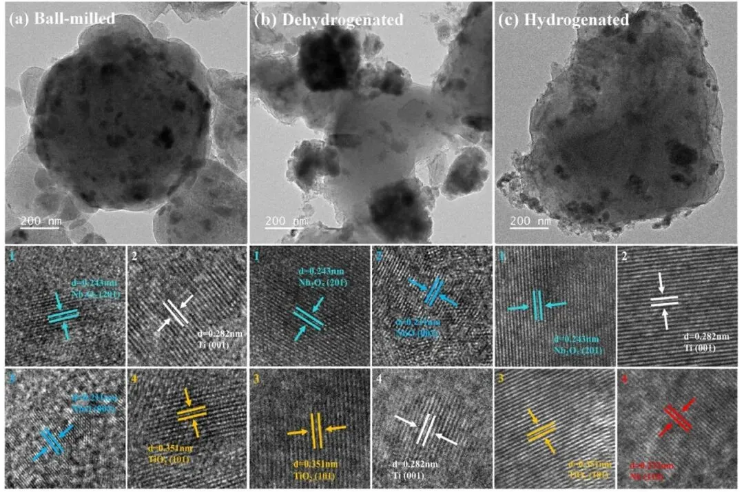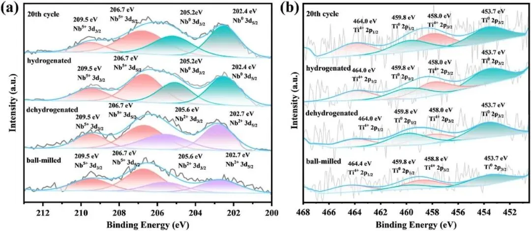 XPS对Nb 3d和Ti 2p的化学态分析表明,球磨过程中Nb₂O₅部分被还原为Nb²+,脱氢后化学态无变化,吸氢及循环后进一步还原为Nb⁰且保持稳定;TiO₂在球磨中部分还原为Ti⁰,脱氢、吸氢及循环过程中化学态无明显变化,仅Ti⁴+峰轻微偏移。HRTEM表征与XPS结果一致,球磨后检测到Nb₂O₅、NbO、Ti、TiO₂的晶格条纹,脱氢后无明显变化,吸氢后NbO消失并出现Nb的(110)晶面,说明NbO进一步还原为单质Nb。