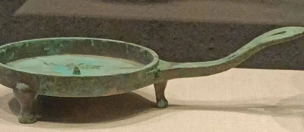 圆形灯盘用来放灯油,中间有烛钎,下面三蹄足,后一长曲柄 ,整体无花纹,也即素面。