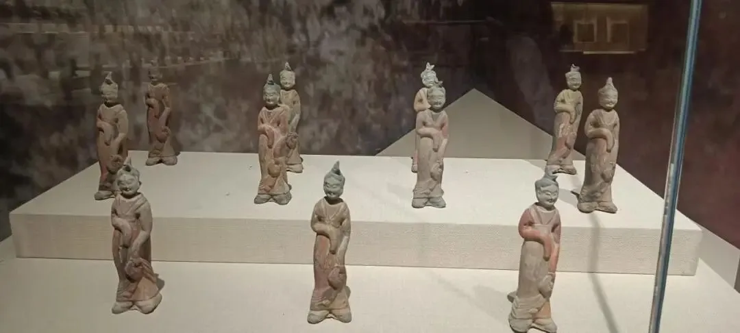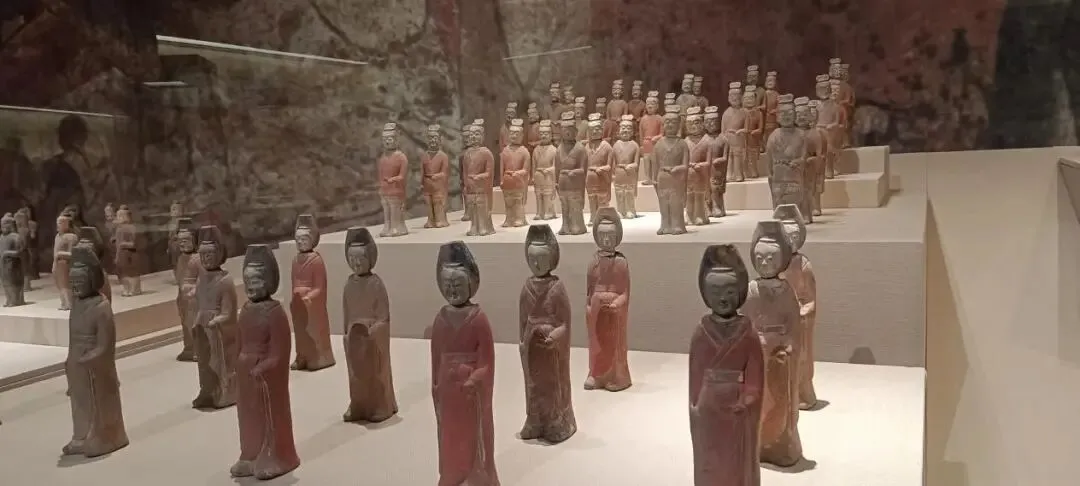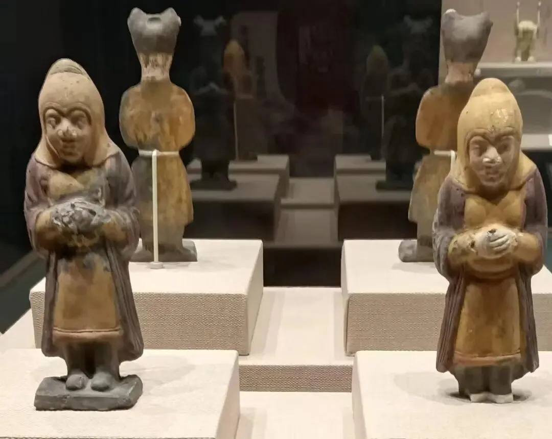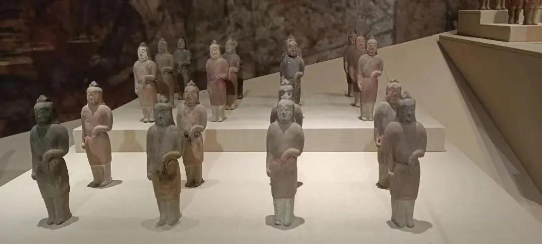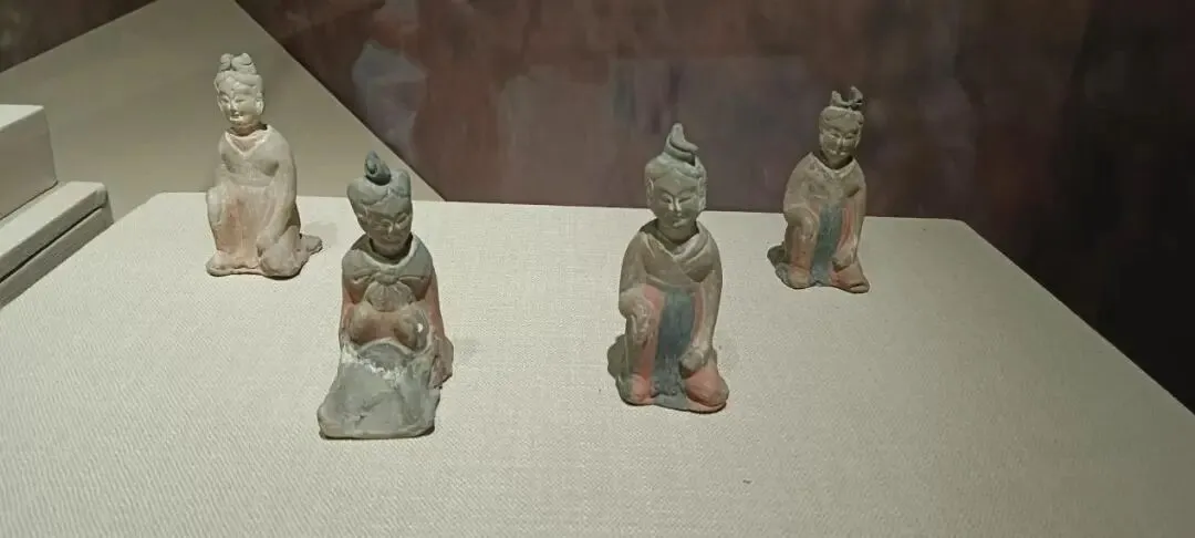 这些侍女俑均是跪坐姿态,身着长裙,面容恬淡。