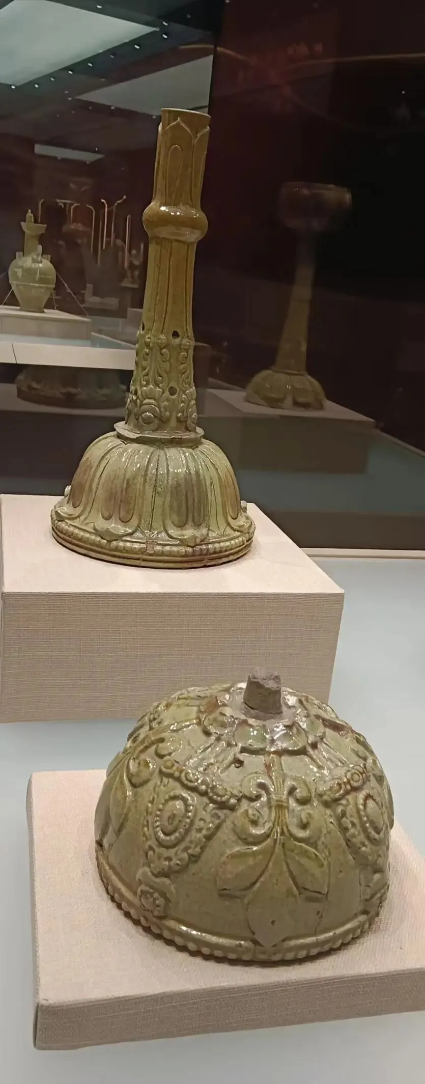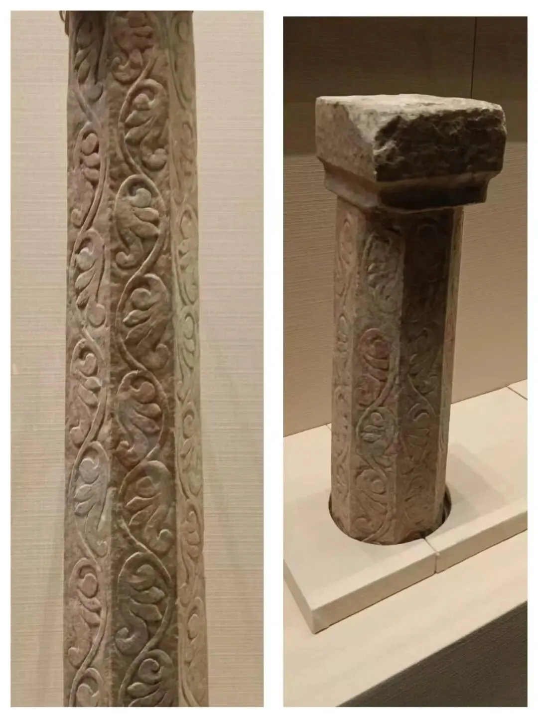 石椁门楣、雕刻忍冬花纹的八棱柱、束腰灯座。