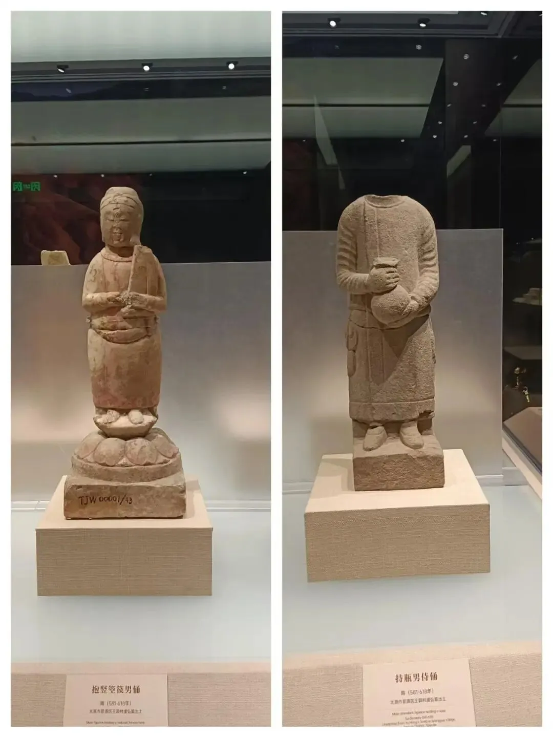 抱竖箜篌男俑、持瓶男侍俑。北齐,太原市晋源区郭村虞弘墓出土。
