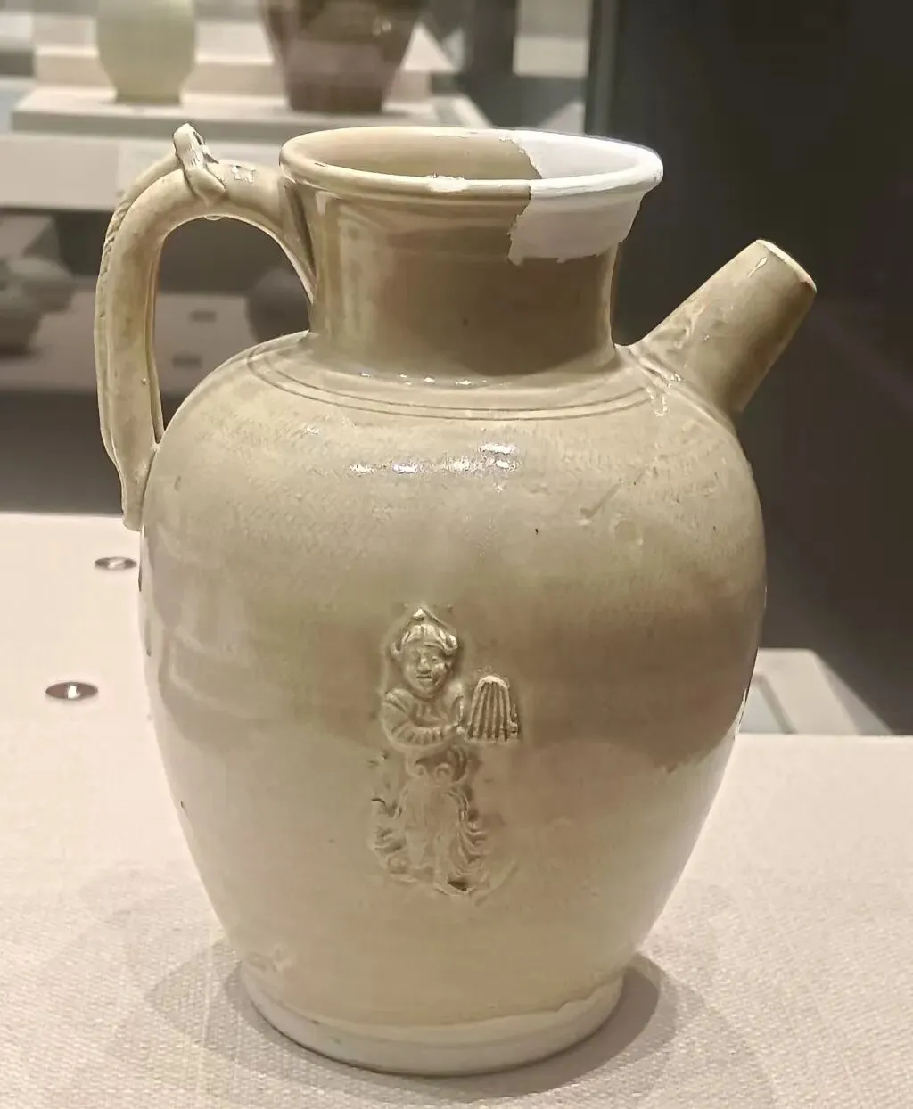 前有管状流,后有兽形柄,腹部有一胡人乐伎开象,胡人头戴尖顶胡帽,手持乐器,可能是拍板。
