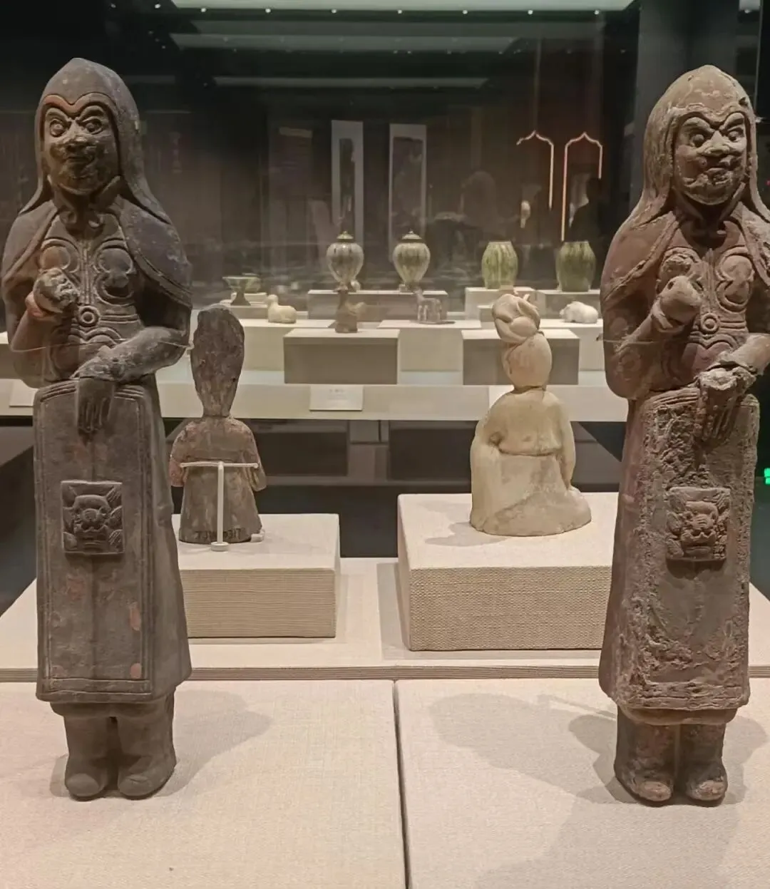 这兄弟俩,身姿挺拔,头戴兜鍪,身披铠甲,面容威严,神情凶悍,右手兵器已不见了,但是左手紧紧执盾,呈现一种誓死保卫主人的磅礴气势。
