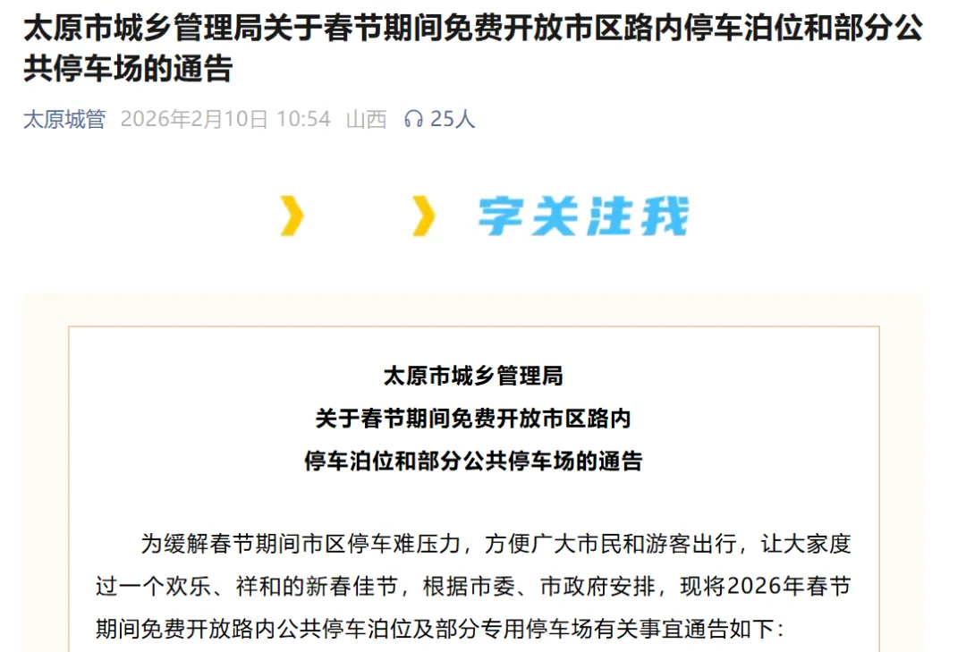 2月10日,太原市城乡管理局发布,关于春节期间免费开放市区路内停车泊位和部分公共停车场的通告:为缓解春节期间市区停车难压力,方便广大市民和游客出行,让大家度过一个欢乐、祥和的新春佳节,根据市委、市政府安排,现将2026年春节期间免费开放路内公共停车泊位及部分专用停车场有关事宜通告如下: