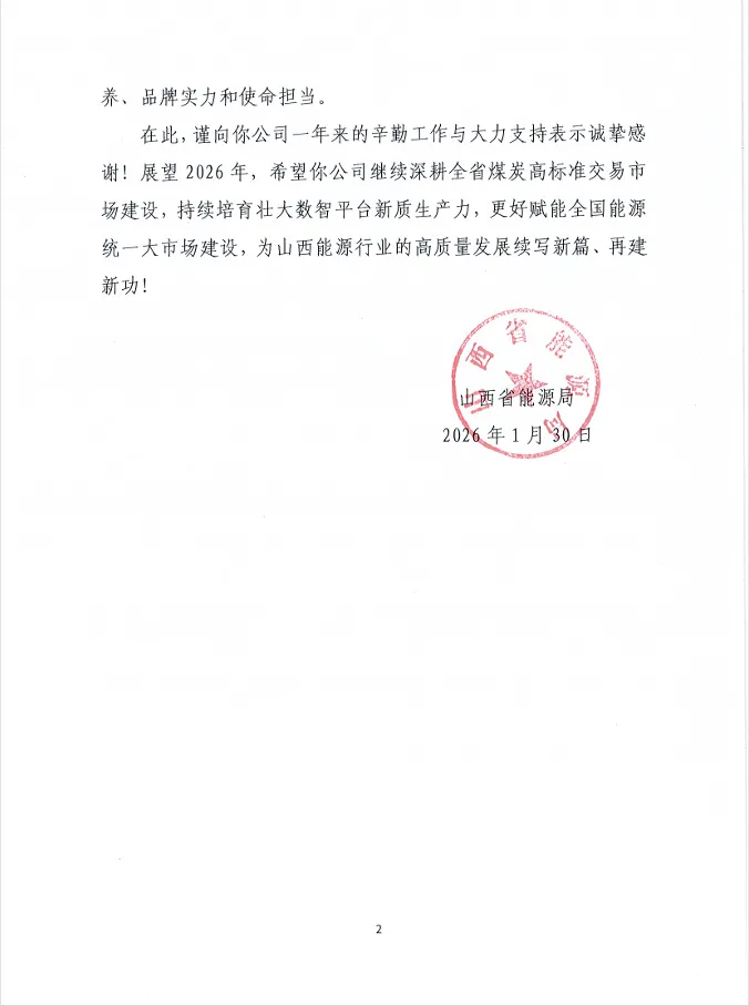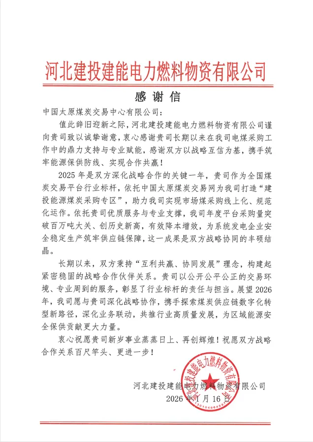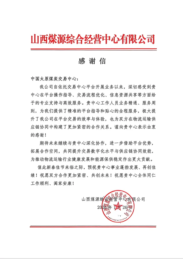 近日,中国太原煤炭交易中心(以下简称“交易中心”)收到山西省能源局、中国煤炭运销协会等多方发来的感谢信。信中对交易中心长期以来给予的帮助与支持致以衷心谢意。并向交易中心全体干部职工致以诚挚的节日祝福。山西省能源局对交易中心一年来的辛勤工作与大力支持表示诚挚感谢。信中指出,2025年,交易中心在全省煤炭高标准交易市场建设、2026年电煤保供中长期合同签订等工作,展现出高度的政治站位与责任担当,积极配合我局推进各项工作。期间,交易中心高效提升平台数智化服务功能,系统修订完善各类制度规则,圆满完成全省电煤保供中长期合同核验等政治工作,有力推动晋陕蒙新交易机构合作交流并成功申报全国首部《煤炭现货交易规则团体标准》,服务推动更多能源企业上线交易,以务实高效的作风和挺膺担当的姿态,为全省经济发展提质增效提供了有力支撑,充分彰显了“中”字头交易机构的专业素养、品牌实力和使命担当。2026年,希望交易中心继续深耕全省煤炭高标准交易市场建设,持续培育壮大数智平台新质生产力,更好赋能全国能源统一大市场建设,为山西能源行业的高质量发展续写新篇、再建新功!中国煤炭运销协会对交易中心过去一年给予的鼎力支持表示由衷感谢。并向交易中心全体员工致以诚挚的节日问候。信中指出,在国家相关部门的决策部署下,交易中心与我会紧密协作,携手制定并发布了《煤炭现货交易规则》团体标准,为推动形成规则一致、开放共享的全国煤炭现货市场体系,构建公平有序、高效畅通的全国煤炭统一大市场提供了重要的基础制度支撑。2026年,期待与交易中心继续携手并肩,充分发挥各自优势,在深化拓展全国煤炭统一大市场、持续完善煤炭交易市场体系、健全推广行业诚信建设等重点领域凝心聚力、开拓进取,共同为煤炭行业的高质量发展与能源安全保障作出新的更大贡献!河北建投建能电力燃料物资有限公司衷心感谢交易中心在我司电煤采购工作中的鼎力支持与专业赋能。信中指出,2025年是双方深化战略合作的关键一年,交易中心作为全国煤炭交易平台行业标杆,打造的“建投能源煤炭采购专区”,助力我司实现市场煤采购线上化、规范化运作。