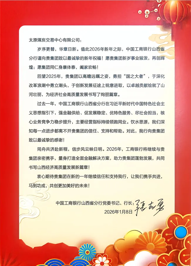 中国工商银行山西省分行对交易中心过去一年的信任、支持和帮助致以诚挚的感谢。信中指出,2025年,中国工商银行山西省分行核心业务竞争力稳步提升,主要经营指标持续领跑同业都离不开交易中心的信任、支持和帮助。2026年,工商银行将继续与交易中心亲密携手,量身打造全面金融解决方案,助力交易中心蓬勃发展,共同书写山西经济高质量发展新篇章!