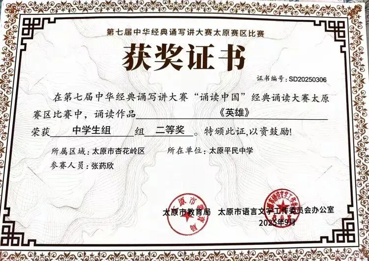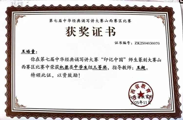 特别值得一提的是,张药欣《英雄》获得山西省“诵读中国”经典诵读大赛二等奖、王皓童获得山西省“印记中国”师生篆刻大赛三等奖。