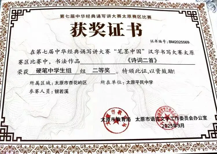 张药欣《英雄》获得太原市“诵读中国”经典诵读大赛二等奖;银若溪《诗词二首》获得太原市“笔墨中国”汉字书写大赛二等奖;聂鑫然《大写的中国》获得太原市“诵读中国”经典诵读大赛三等奖;罗昊坤《沁园春 长沙》获得太原市“笔墨中国”汉字书写大赛三等奖;曹芮嘉《春江花月夜》、张龙涛《陋室铭》、张瀚伊《中国话》、获得太原市“诵读中国”经典诵读大赛优秀奖;韩铠泽《如果信仰有颜色》获得太原市“笔墨中国”汉字书写大赛优秀奖。
