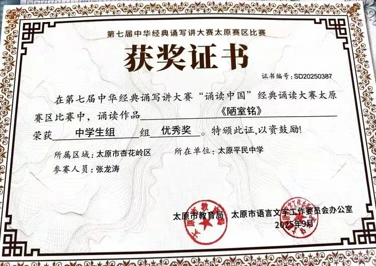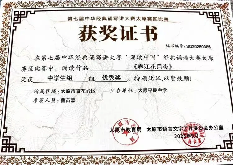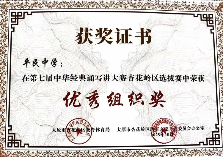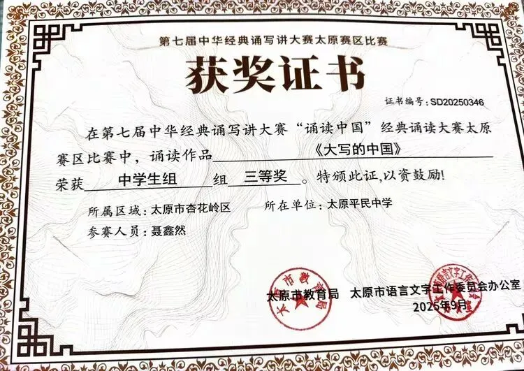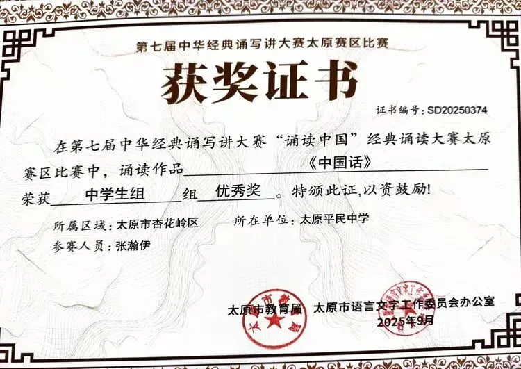 ——太原平民中学在第七届中华经典诵写讲大赛中斩获多项荣誉