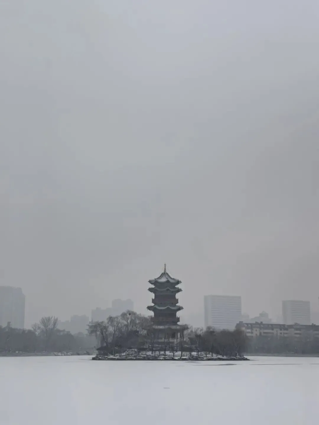 冰封的迎泽湖,盖着一层厚厚的白雪,不知道是谁,在雪面上留下了一行字:“喂,你好吗!”