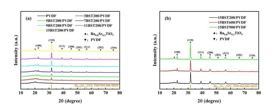 图1 (a) 不同BST200填料体积分数的BST/PVDF薄膜的X射线衍射图;(b) 不同BST填料粒径的BST/PVDF薄膜的X射线衍射图。