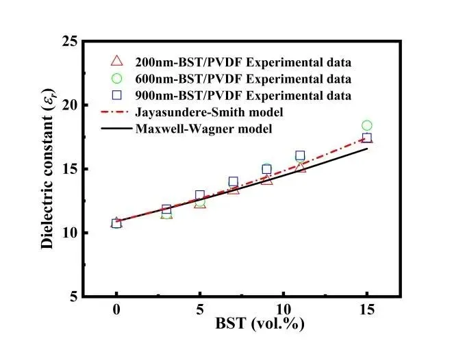 (1)介电常数显著提升:BST填料的引入显著提高了PVDF基复合材料的介电常数,且介电常数随BST体积分数的增加而增加。粒径效应:较小粒径的BST填料在复合材料中产生的界面缺陷较少,有利于介电常数的提升。