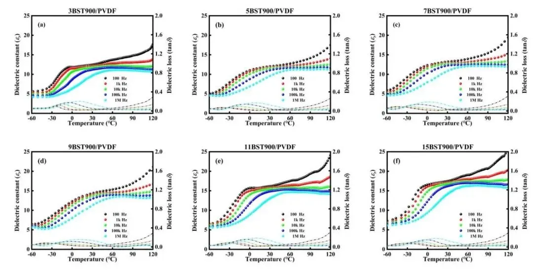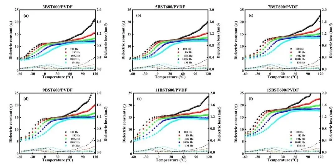 系统研究了BST/PVDF复合材料在-60~120 ℃温度范围内的介电性能变化,揭示了温度对复合材料介电性能的影响规律。温度效应解析:通过介电温谱分析,明确了复合材料在不同温度下的介电弛豫过程和极化机制,为高温或低温环境下的应用提供了理论支持。