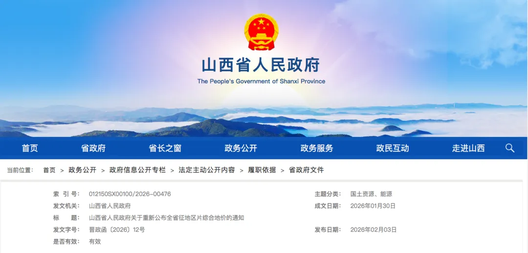 近日,山西省人民政府正式发布《关于重新公布全省征地区片综合地价的通知》(晋政函〔2026〕12号),标志着全省土地征收补偿标准进入新阶段。