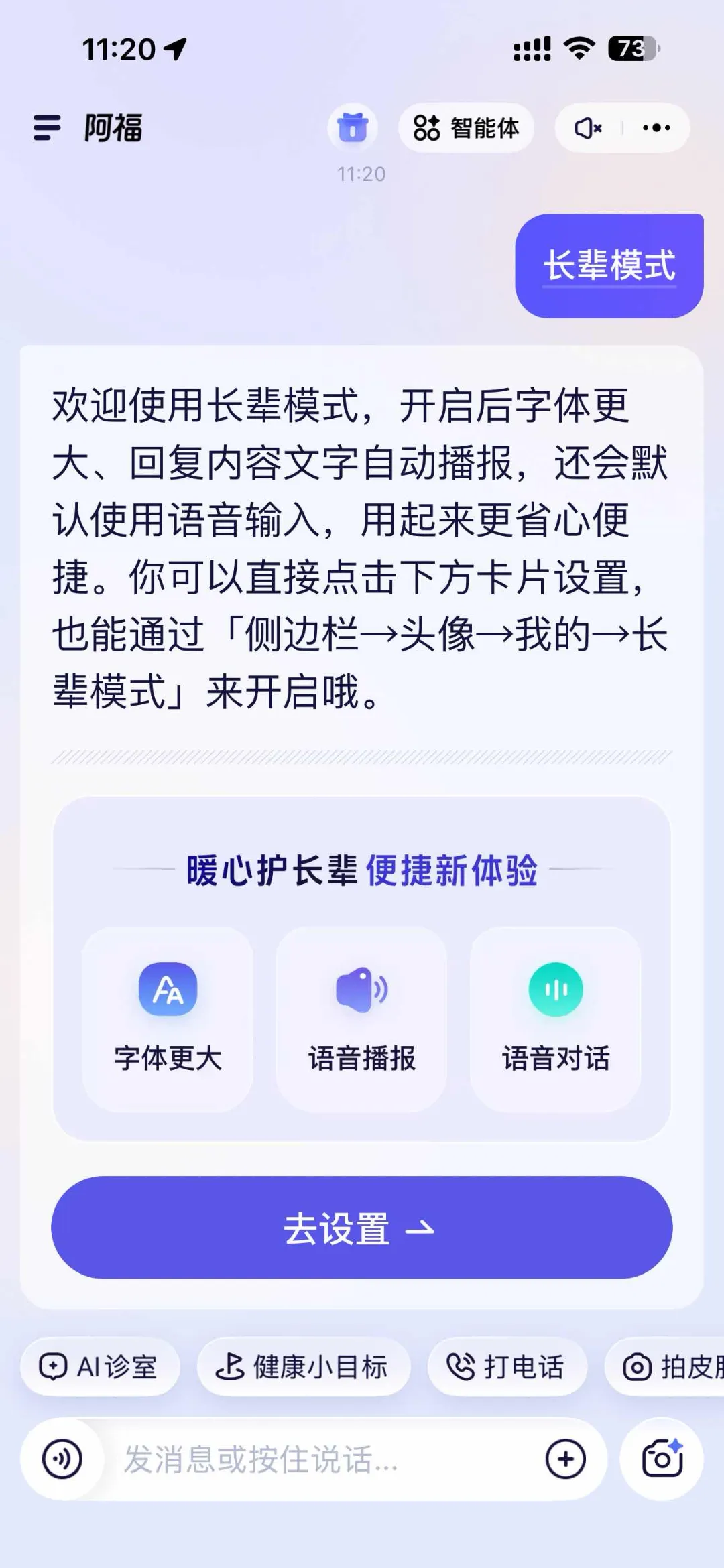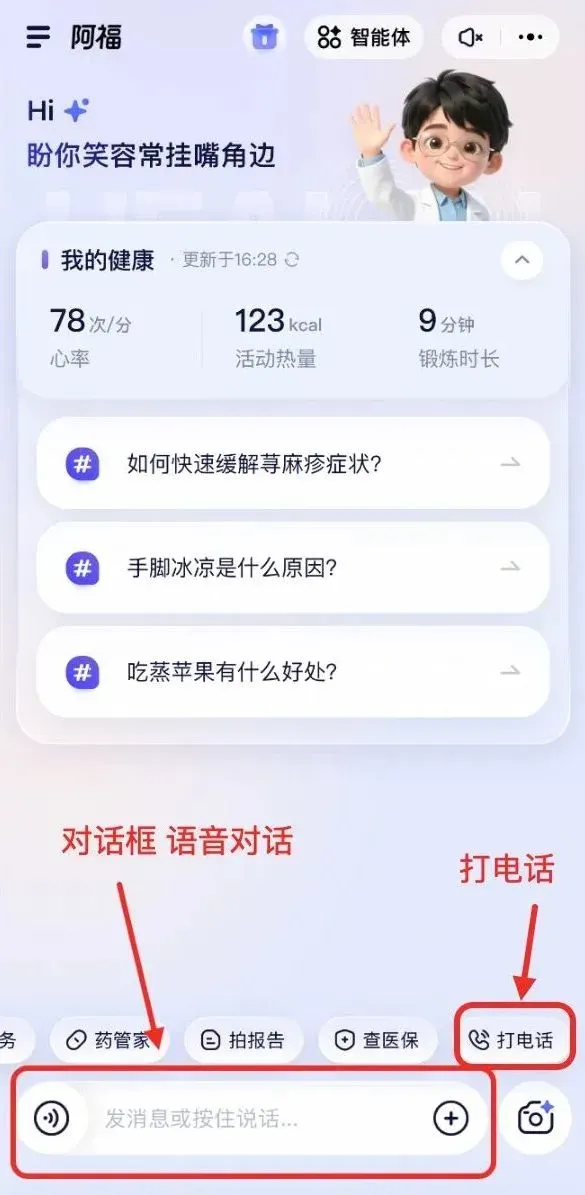 爸妈平时不舒服,可以问阿福,语音问打电话问,都可以。