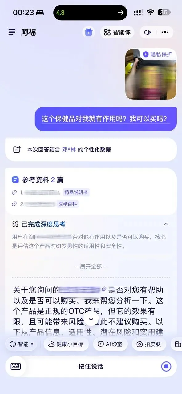 不仅能问,还可以拍体检报告,让阿福帮你解读。可以拍药盒,问这药怎么吃。可以拍皮肤,问不明白的问题拍给阿福看。